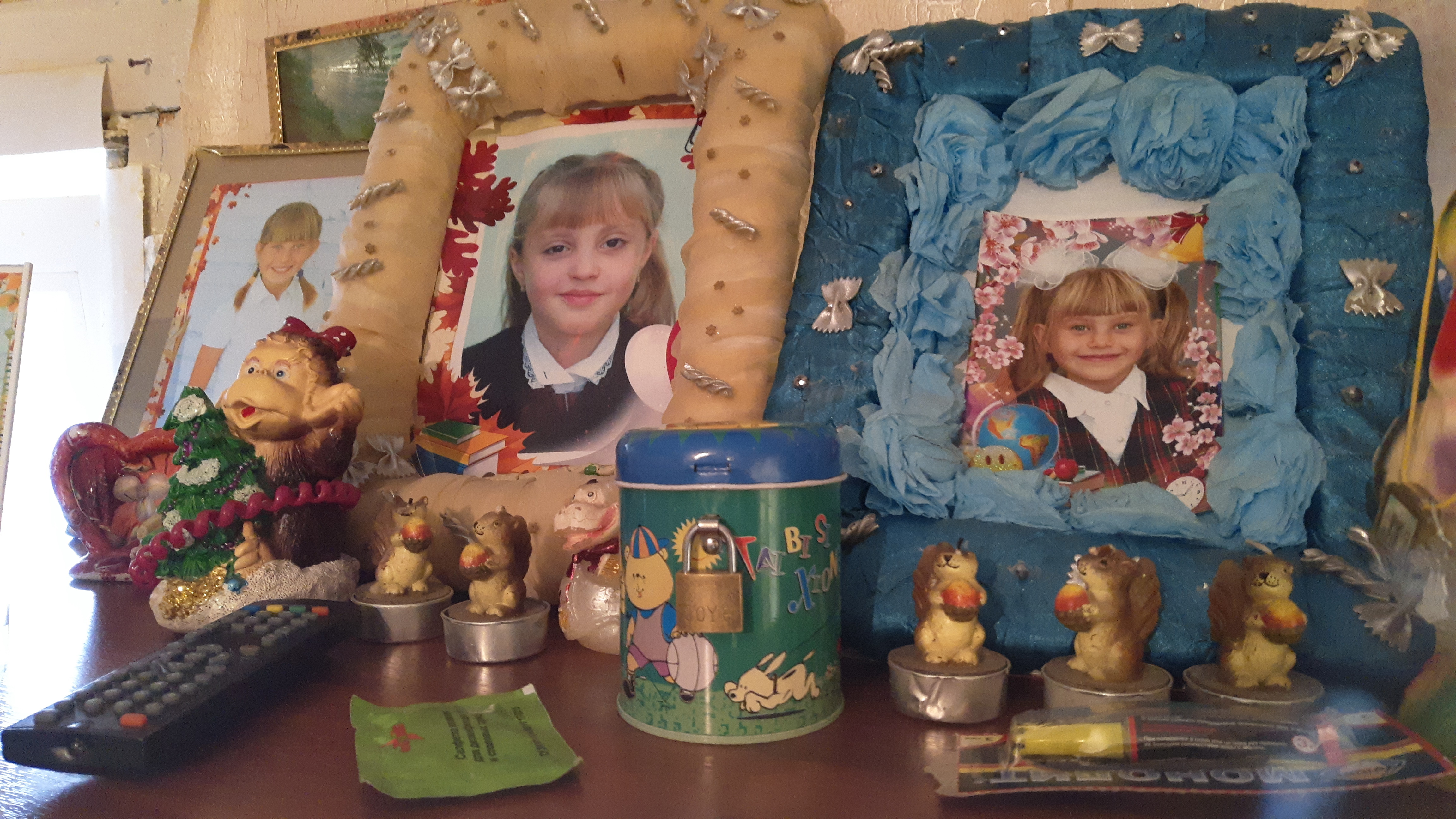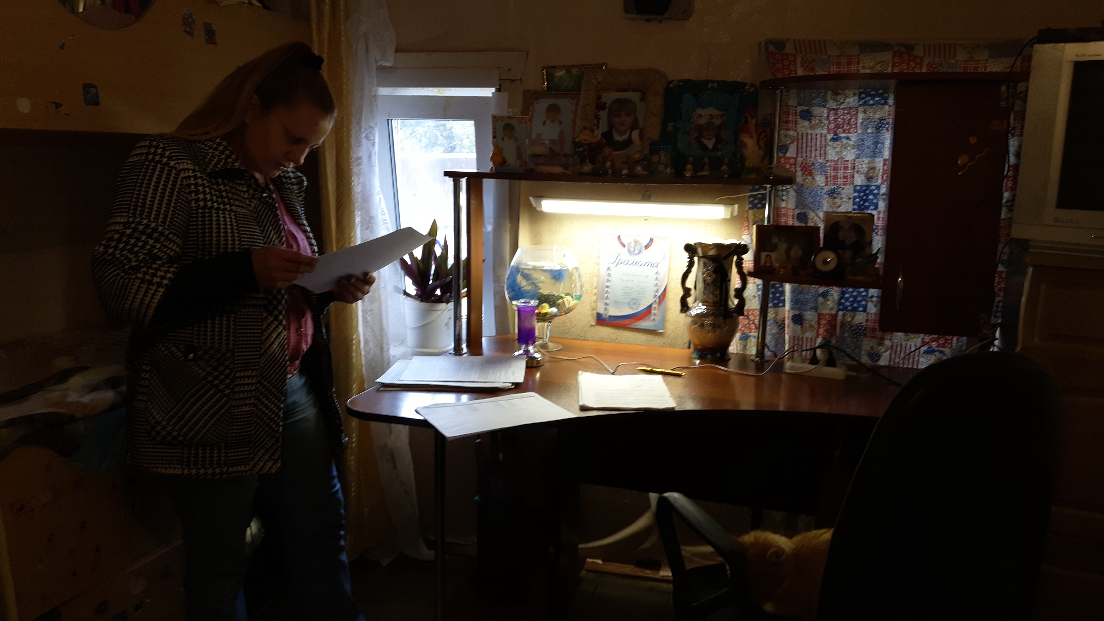 В детской уютно – резные полочки на стенах ("В богатом доме мебель разбирали. Я помогала, мне отдали"), на полках – фотографии Олиных дочерей в фоторамках. На столе – аквариум с рыбками ("сестра дала"). Ее дети любят разную живность, поэтому в доме помимо рыбок живут два рыжих кота и щенок таксы по кличке Чопик.