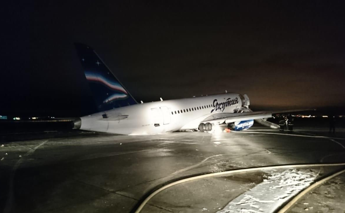 На фото и видео ЧП с самолетом авиакомпании "Якутия" видно, что из-за сломанной опоры шасси Sukhoj Superjet-100 лежит "на брюхе", из него выливается керосин. Для эвакуации пассажиров пришлось использовать аварийные трапы.