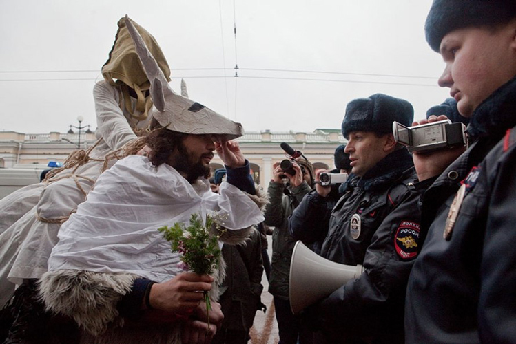 Осмысляя горизонты социальной чувствительности в современном российском искусстве, COLTA.RU заглянула в лабораторию одной из самых громких арт-групп Петербурга. Автор статьи — этот современный художник — рассказал об опыте своего участия в перформансах и проектах группы и уже со стороны проанализировал ее вклад в формирование новой эстетики политического искусства с его заметной опорой на поэзию, мистику и символические жесты. Авторская орфография сохранена.