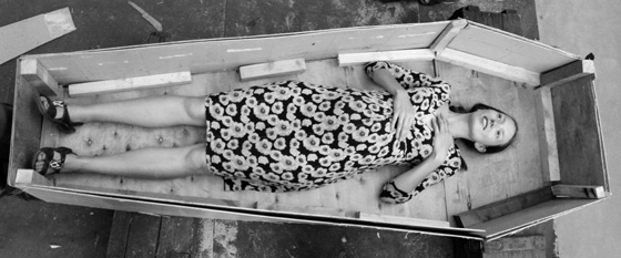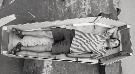 по приглашению независимого куратора александра белова {родина} провела «двухдневную арт-вахту» — ночные бдения на крыше независимой галереи bobby gallery, во время которых мы непрерывно печатали отчет, состоявший из смеси новостей из сми, которые мы узнавали по телефону, и наших собственных мыслей, ощущений и наблюдений, и по очереди спали в собственноручно сколоченном деревянном гробу. перформанс назывался «начеку» и вошел в параллельную программу биеннале manifesta 10.