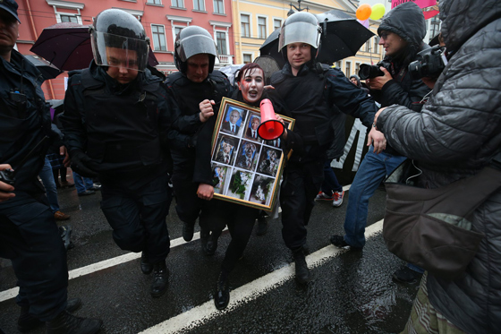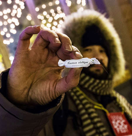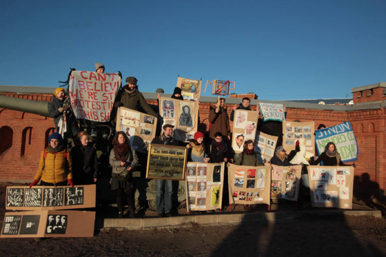 © Вадим Ф. Лурье {не мир}. передвижная антивоенная выставка. 2015 г., санкт-петербург еще больший резонанс возник после задержания участников во время повторного проведения выставки в москве. абсурдность обвинений и величина штрафов (10—20 т.р.) при полном отсутствии какого бы то ни было деяния, будь то противоправного или даже вообще хотя бы какого-нибудь (в протоколах читаем буквально «несанкционированное шествие от дома 6 до дома 8»), — не выходи из комнаты, не совершай административное правонарушение по статье двадцать точка два — все это сработало на привлечение внимания и сочувствия к проекту.