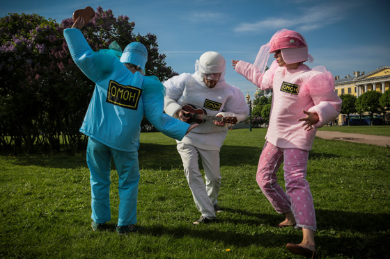 © Евгений Курсков нежный омон. акция. 2017 г., санкт-петербург в жестоких играх {родины} со зрителями (и друг с другом) приверженец классического психоанализа может усмотреть и садомазохистский компонент — в полной мере эта эротическая диалектика власти проявляется в серии акций «ради вашей безопасности», когда {родина} вторгается на чужие выставки и связывает веревками всех и вся, включая зрителей, участников мероприятий и неодушевленные предметы, одновременно с помощью громкоговорителя призывая «сохранять спокойствие», так как «все это ради вашей безопасности», а также в акции «нежный омон», когда родинцы в костюмах и шлемах пастельных цветов с нашивками омона предавались пасторальным забавам на марсовом поле.