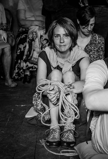 похожим образом функционирует и другой перформанс {родины} «право голоса. оральное сопротивление». двое ведущих — те же самые мужчина и женщина — очерчивают контекст, называя происходящее «телешоу». у них в руках микрофоны, которые они периодически протягивают зрителям, предлагая ответить на вопросы, — но моментально их отдергивают и заканчивают или полностью придумывают заново, перевирают слова собеседников.