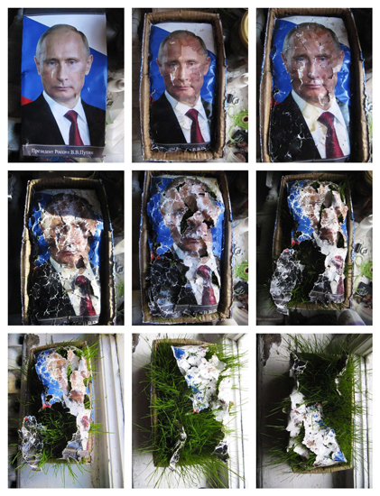 этот современный художник мычит что-то с заклеенным ртом (так как это я, то я знаю, что он читает «белеет парус одинокий» и «во глубине сибирских руд»), а затем ест из тарелки нечто, более всего напоминающее землю, посыпая это солью и запивая водкой. на его лбу написано «free pussy riot». землей его кормит с ложки ведущий, приговаривая: