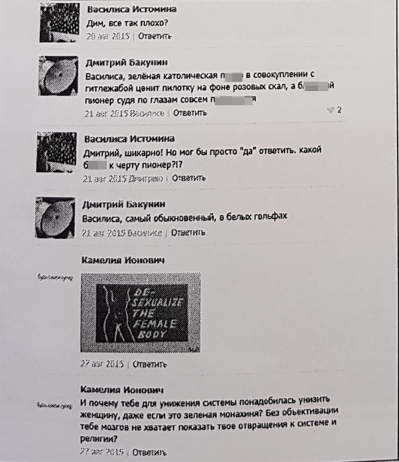«Они дают заключение по всем картинкам, что они оскорбляют и все такое прочее. Но заключение это не соответствует закону: отсутствует подписка экспертов, где они предупреждены об ответственности за дачу заведомо ложного заключения. Этой расписки в подлиннике в деле нет, есть только ксерокопия, и она появилась после моего ходатайства, которое я заявила весной, о том, что экспертиза не может быть признана допустимым доказательством, — говорит она. — И следователю на электронную почту эксперты дают ответ, что мы можем вам прислать подписку, но — за ваш счет. Почему-то следствие пожалело 100 рублей».