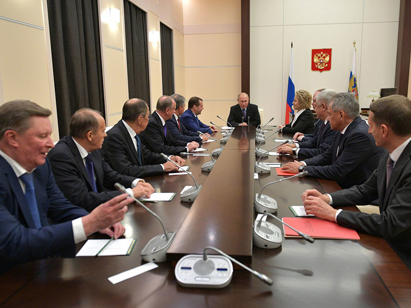 В совещании приняли участие премьер-министр Дмитрий Медведев, спикеры обеих палат парламента Валентина Матвиенко и Вячеслав Володин, глава администрации Кремля Антон Вайно, секретарь Совбеза Николай Патрушев, министры внутренних дел Владимир Колокольцев, иностранных дел Сергей Лавров, обороны Сергей Шойгу, директор ФСБ Александр Бортников, глава СВР Сергей Нарышкин, спецпредставитель президента по вопросам природоохранной деятельности, экологии и транспорта Сергей Иванов.