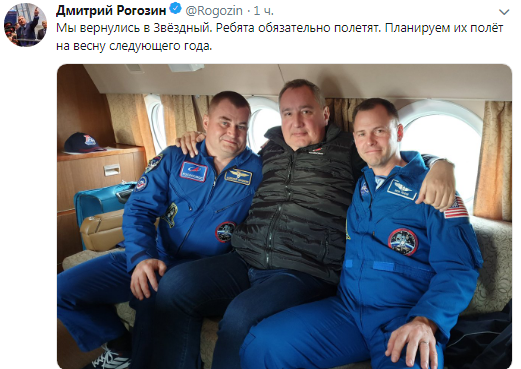 «Мы вернулись в Звездный. Ребята обязательно полетят. Планируем их полет на весну следующего года», — написал глава «Роскосмоса» Дмитрий Рогозин в Twitter.