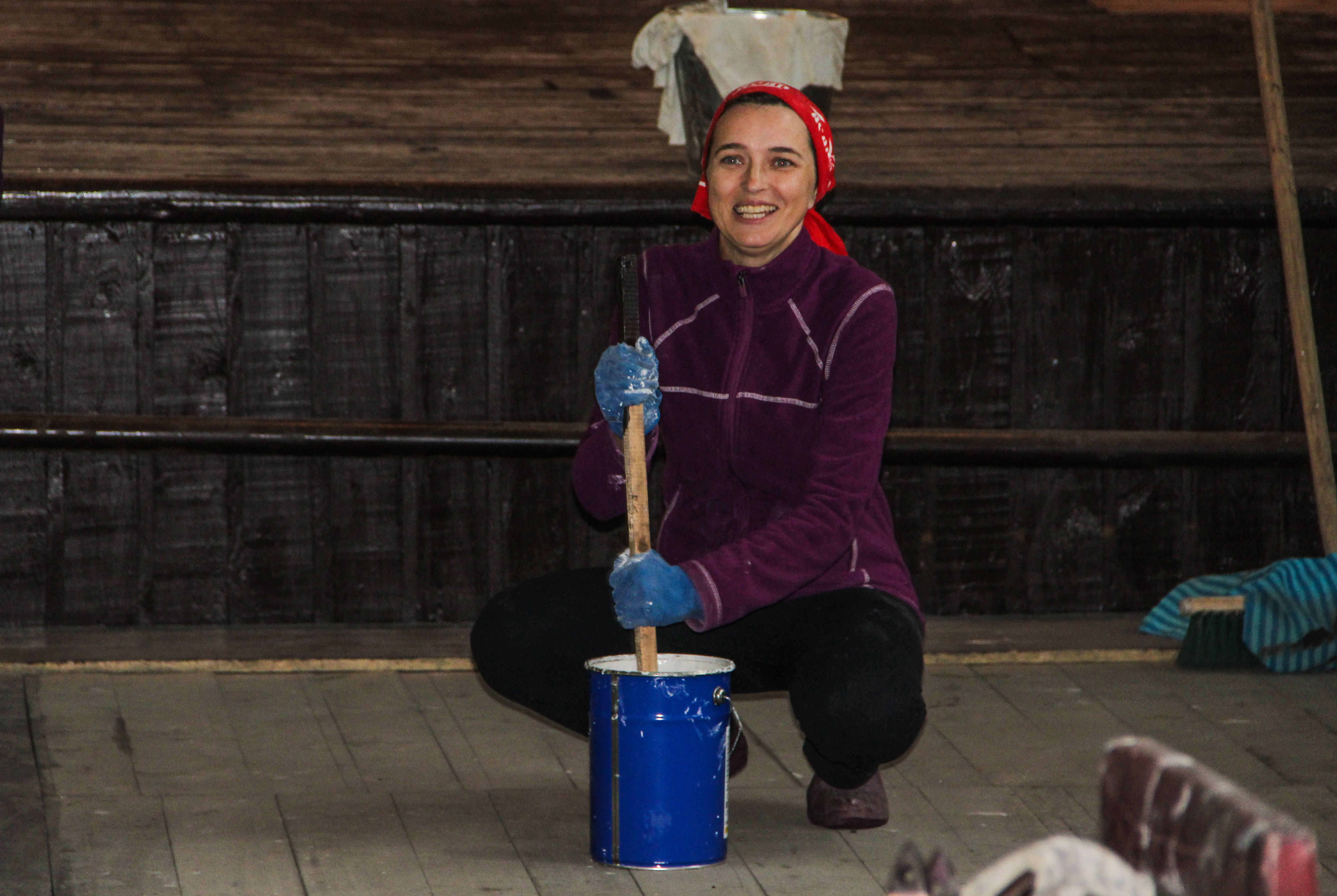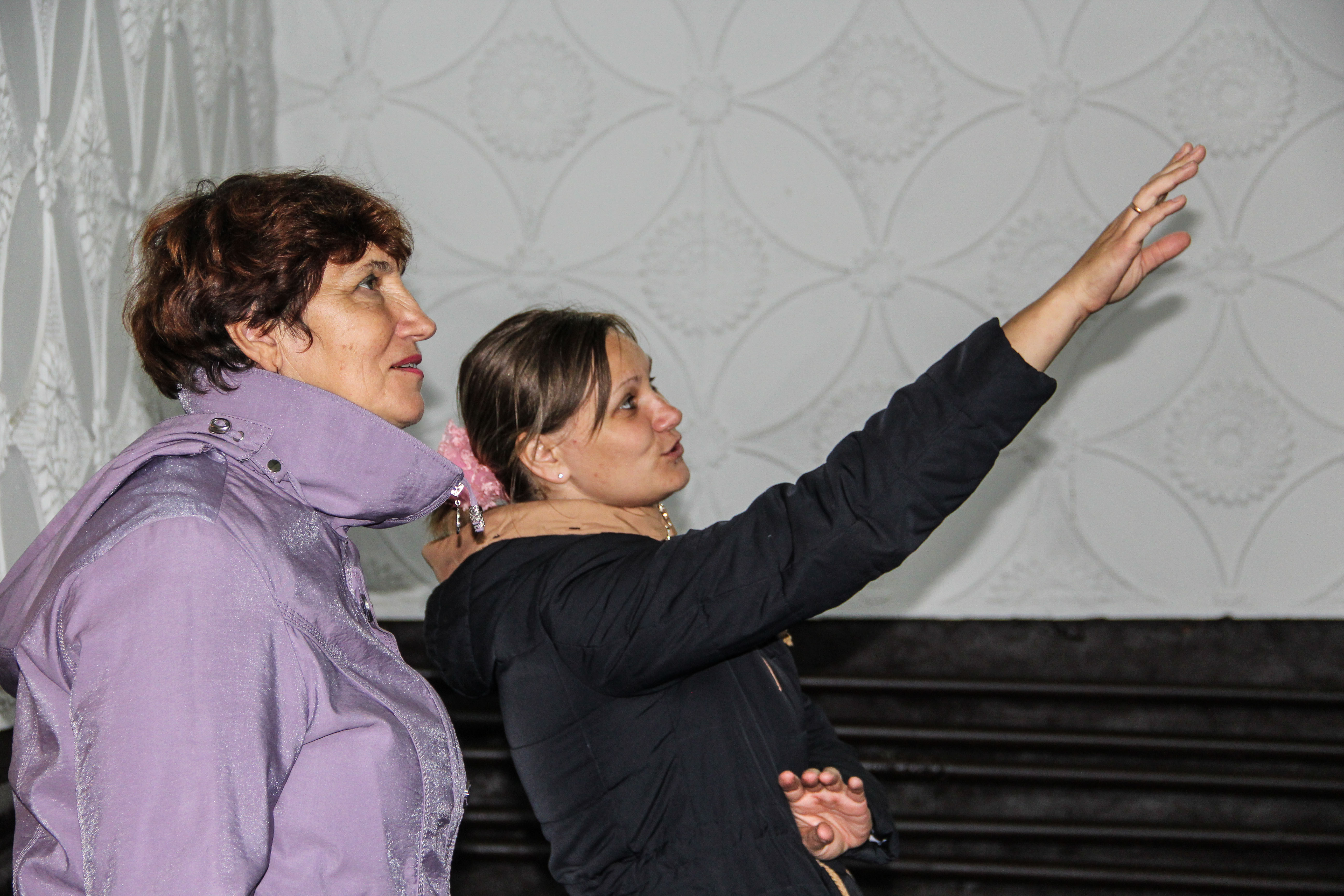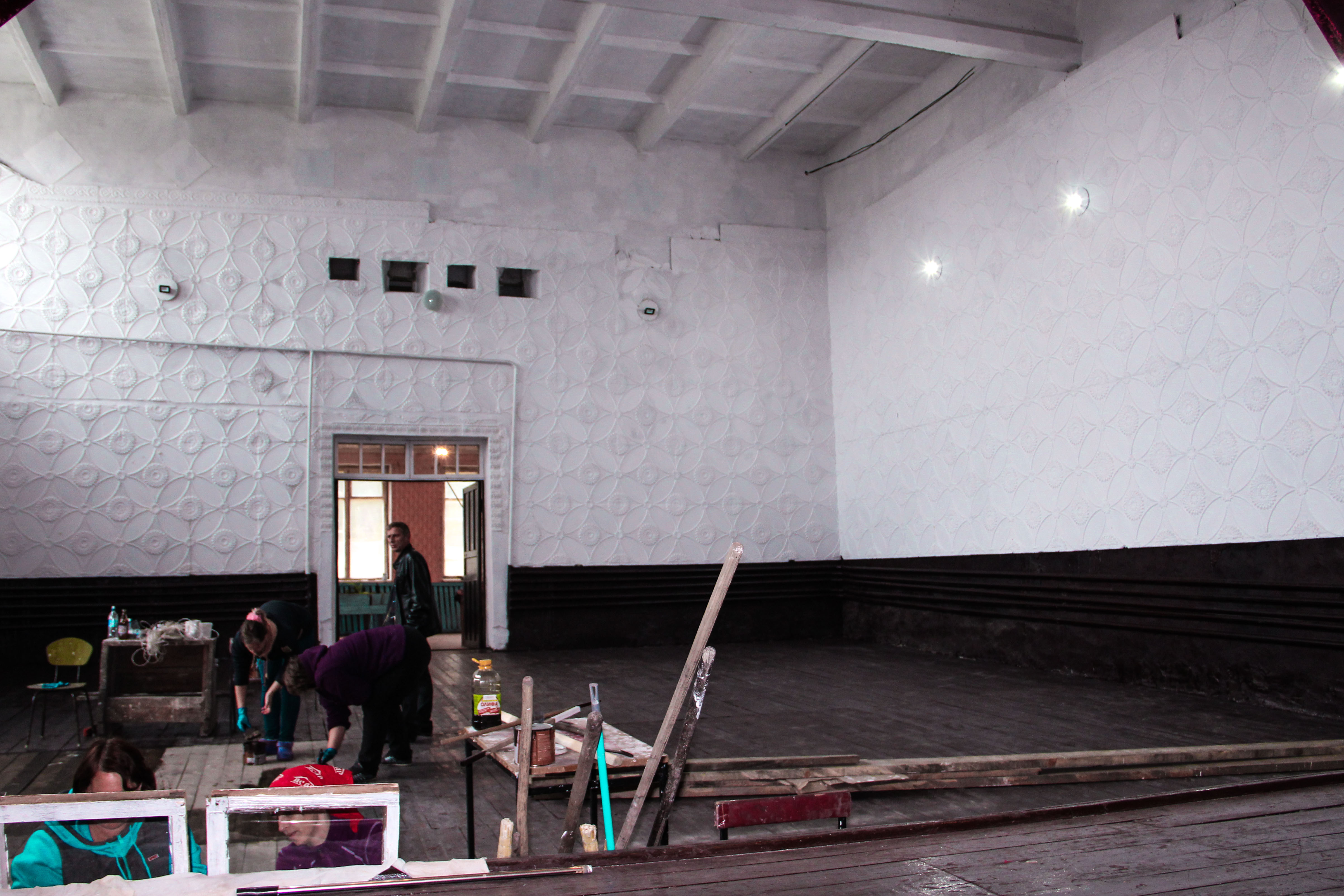 – Вскрыли пол и вывезли весь мусор, – вспоминает Ирина. – Его оказалось на несколько больших телег, так как под полом был "похоронен" гипсовый потолок, который когда-то осыпался после протечки крыши клуба. Затем нужно было решить более сложную проблему: очистить стены и потолок от слоя копоти и сажи. Высота потолков приличная, поэтому потребовались леса и смелые мужчины, которым приходилось работать просто в условиях пылевой бури. После этого нужны были смелые женщины, которые не побоялись бы белить на высоте более 6 метров.