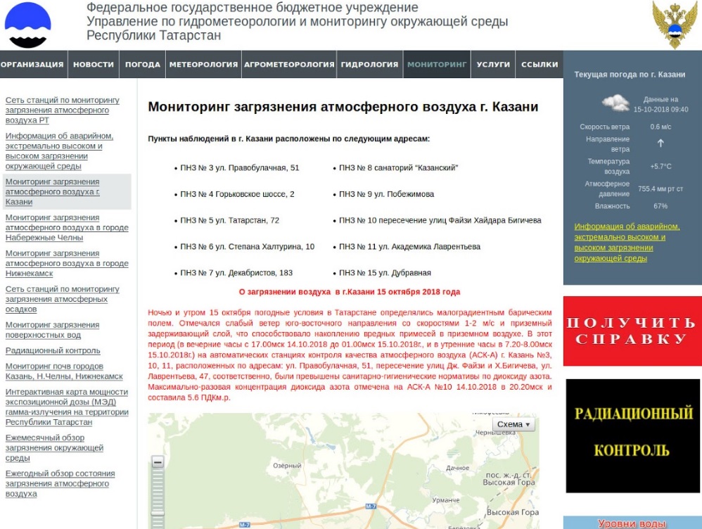 Управление по гидрометеорологии и мониторингу окружающей среды Республики Татарстан сообщает о превышениях ПДК в атмосферном воздухе Казани по диоксиду азота. Превышения наблюдались с вечера 14 октября до утра 15 октября на автоматических станциях контроля качества атмосферного воздуха, расположенных на пересечении улиц Джаудата Файзи и Хайдара Бигичева, и по адресам: ул. Лаврентьева, 47 и ул. Правобулачная, 51.