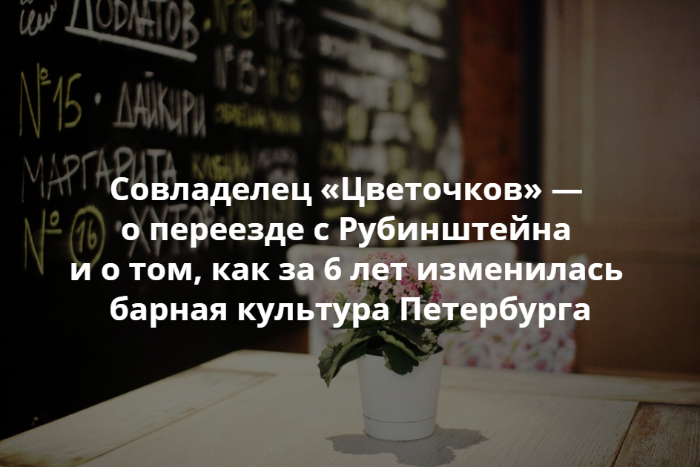Где шесть лет назад развлекались петербуржцы, как с 2012-го изменилась улица Рубинштейна и отчего «интеллигентное петербургское пьянство» переместилось на Некрасова? Совладелец «Цветочков» и «Сидрерии» Дмитрий Миронов рассказывает, как в помещении цветочного магазина построили бар, почему там перестали курить на год раньше официального запрета и часто ли конфликтовали с соседями из-за шума.