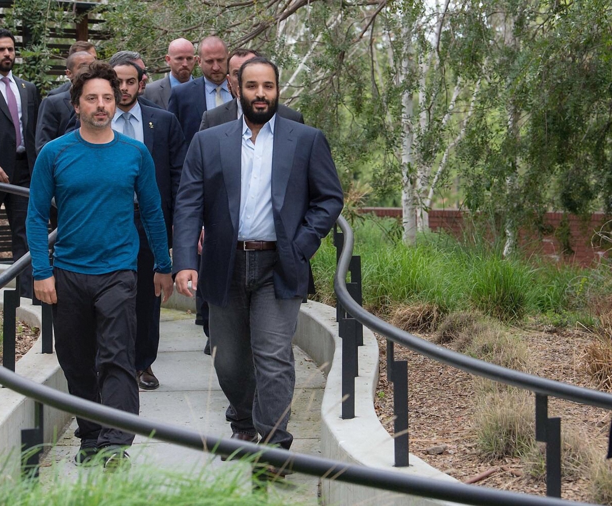 Только визит в Кремниевую долину мог заставить принца Мухаммеда бен Салмана (справа, слева — сооснователь Google Сергей Брин) сменить традиционную одежду на европейский костюм. Фото: Abaca Press/TASS