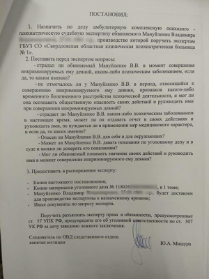 Мануйленко прислал изданию постановление об экспертизе, которая должна пройти 23 октября в Свердловской областной психиатрической больнице № 1.