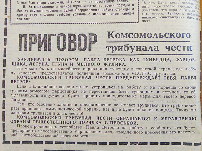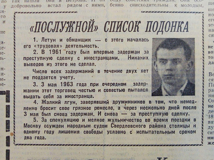Попадались, как правило, те, кто совмещал фарцовку с другими преступлениями: например, у кого находили наркотики или порнографию (за нее могли сойти pin-up открытки или журналы Playboy). Наказывать могли жестко. Была история, когда фарцовщик, возвращаясь с ночной попойки, пырнул ножом молодого человека, который выжил и оказался то ли дружинником, то ли комсомольцем. Фарцовщика и его друзей поймали, осудили за нанесение тяжких повреждений. Ленинградские газеты потребовали «самого жесткого суда» для этой компании из-за их занятости — одного из ребят расстреляли. Потом выяснилось, что там была замешана и валюта, и другие махинации.