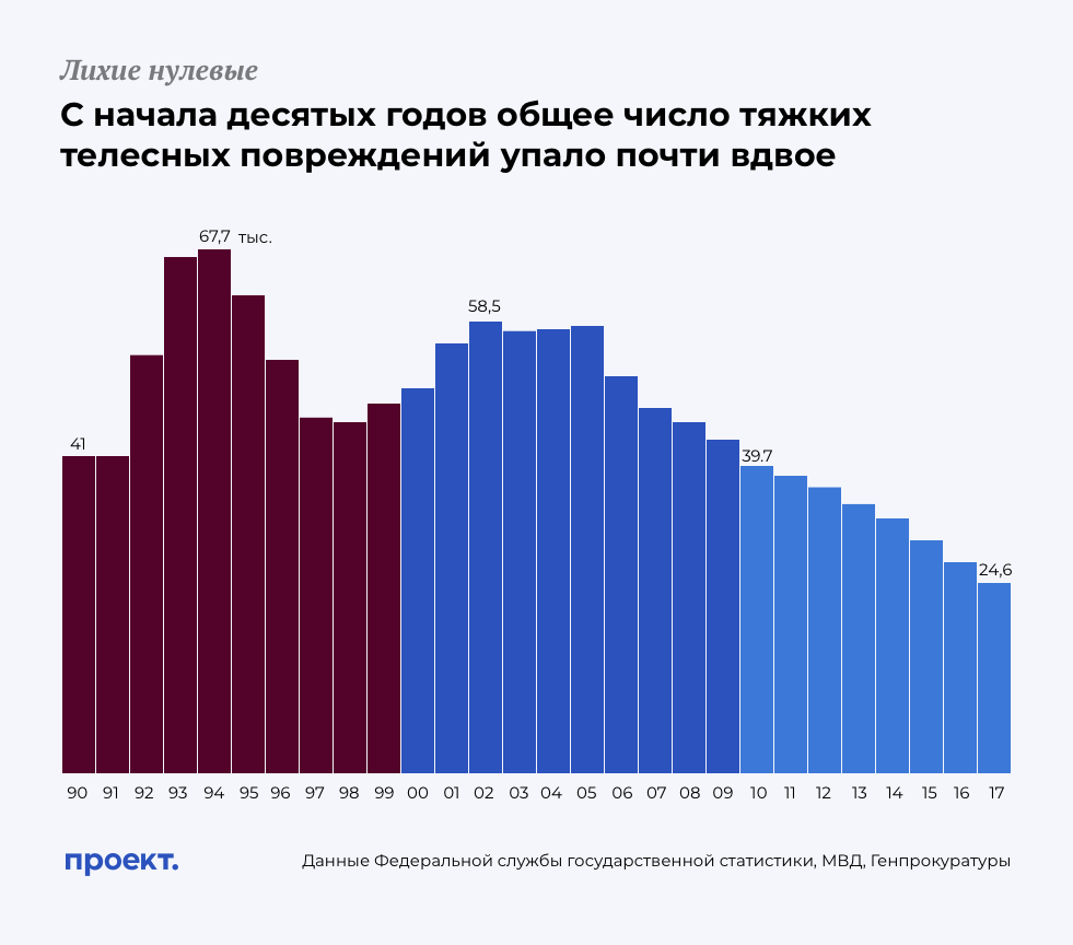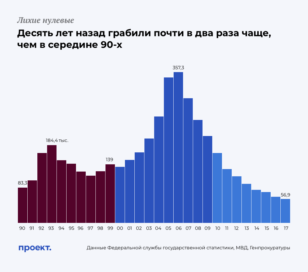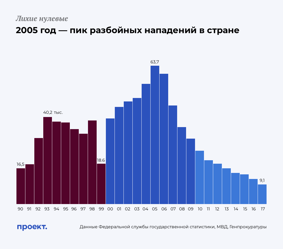 Рекордный год «девяностых» — 1993 год (40 тысяч разбойных нападений), а 2005 — самый неблагоприятный год нулевых (63,7 тысячи).