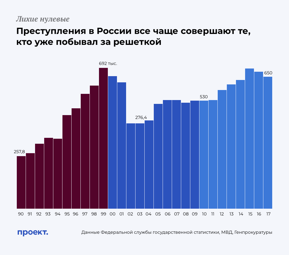 Претензии к российской пенитенциарной системе многочисленны и хорошо известны. Криминальная статистика позволяет выдвинуть и еще одну, очень важную претензию — российская тюрьма все реже исправляет преступников. В нулевые, а затем и в десятые растет количество рецидивов — даже при том, что к концу десятых общее количество преступлений снижается