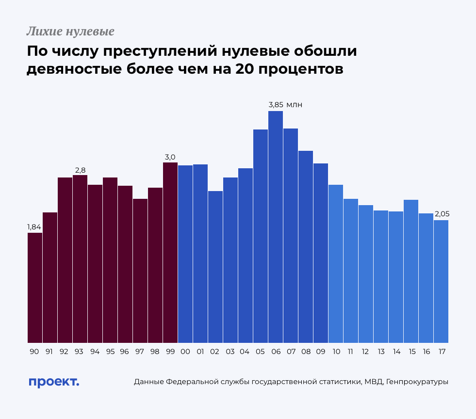 Рекордным по количеству преступлений в девяностых стал 1999-й — год фактического прихода к власти Путина. В этом году было совершено больше трех миллионов преступлений.