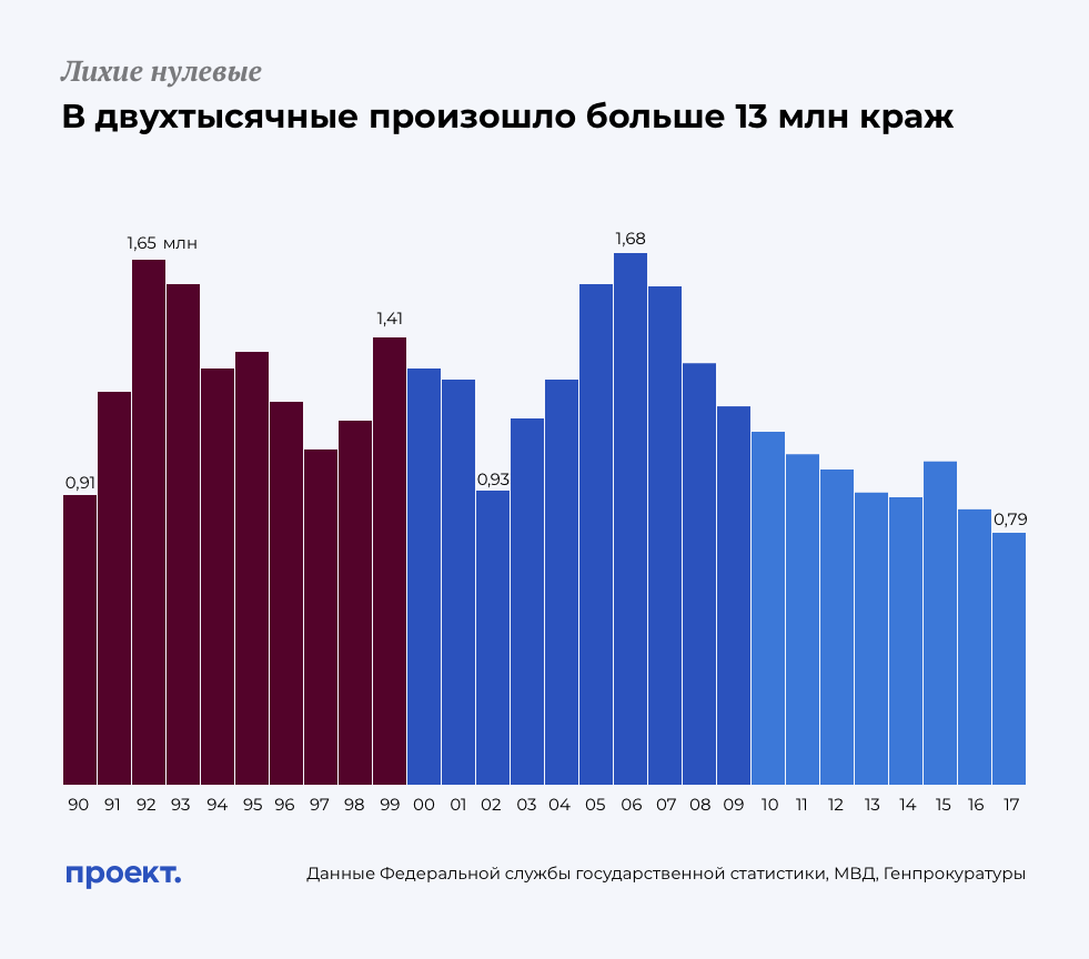 Возможно, именно поэтому «стабильные» двухтысячные обходят по количеству краж «лихие» девяностые — 13,2 млн преступлений во второе десятилетие новой России, и 12,9 млн — в первое.