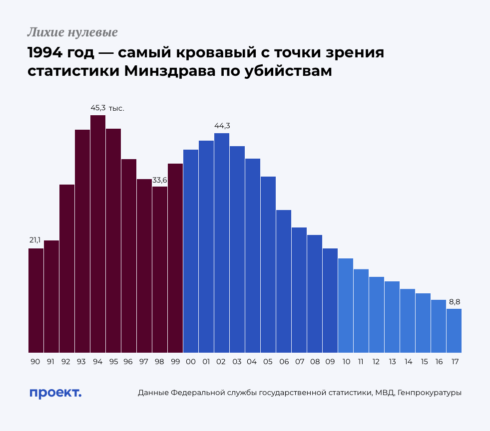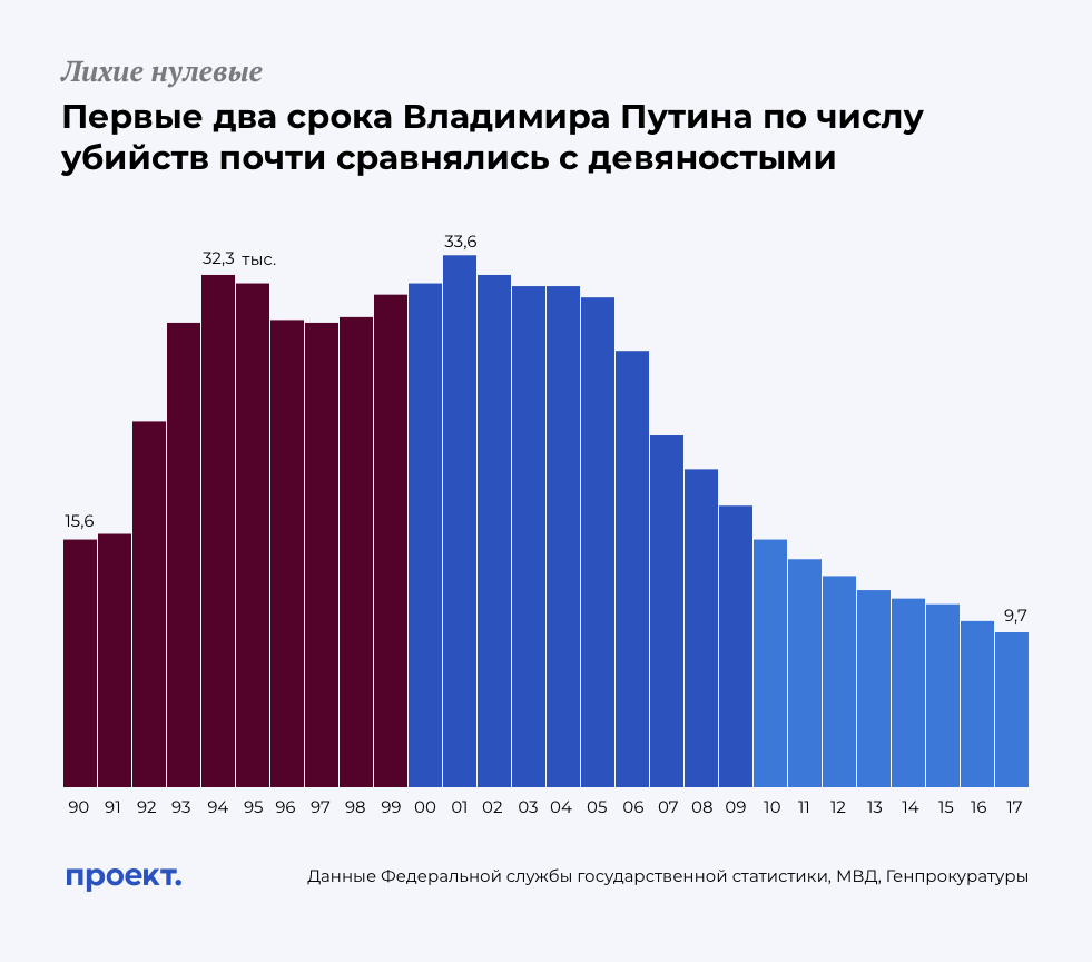 Однако в 2001 году, спустя 2 года после прихода Путина к власти, рекорд 1994-го будет побит (32 тысячи в девяностых против 33,6 тысяч в нулевых). При этом военные кампании на Кавказе не влияют на статистику: согласно методике ООН, которую используют ведомства, человеческие потери во время боевых действий ни среди военных, ни среди мирного населения не включаются в число погибших от убийств. Исключение составляют случаи, когда от рук комбатантов мирное население гибнет в «небоевое время» — например, это убийство чеченской девушки Эльзы Кунгаевой, за которое был осужден полковник Юрий Буданов.