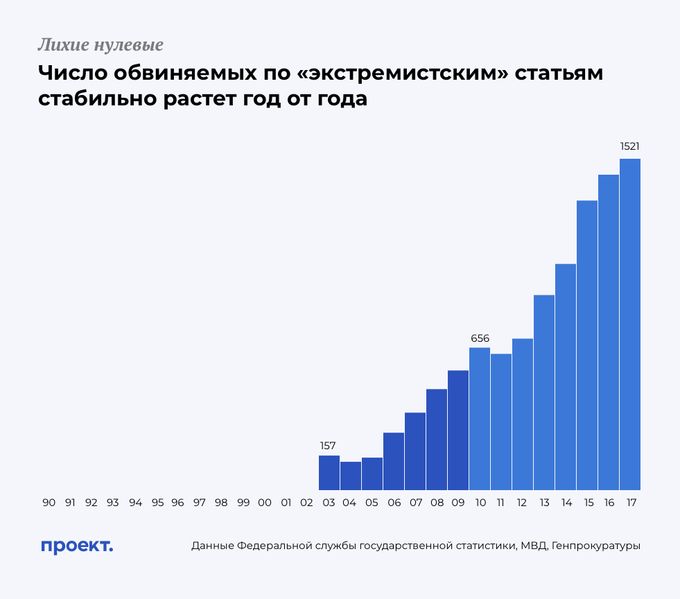 С тех пор статьи 282 («возбуждение ненависти по признакам пола, расы, национальности или социальной группы») и 280 («публичные призывы к осуществлению экстремистской деятельности») — два главных положения УК, количество дел по которым неуклонно увеличивается.