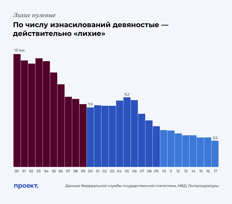 Тем не менее по этому показателю «девяностые» — действительно гораздо более «лихие», чем нынешние годы. Пик изнасилований пришелся на 1993 год — почти 14,4 тысячи, затем после небольшого спада очередной всплеск в 2005 — 9,2 тысяч. После 2005-го уровень изнасилований постоянно падает — в среднем на 7,5% в год.