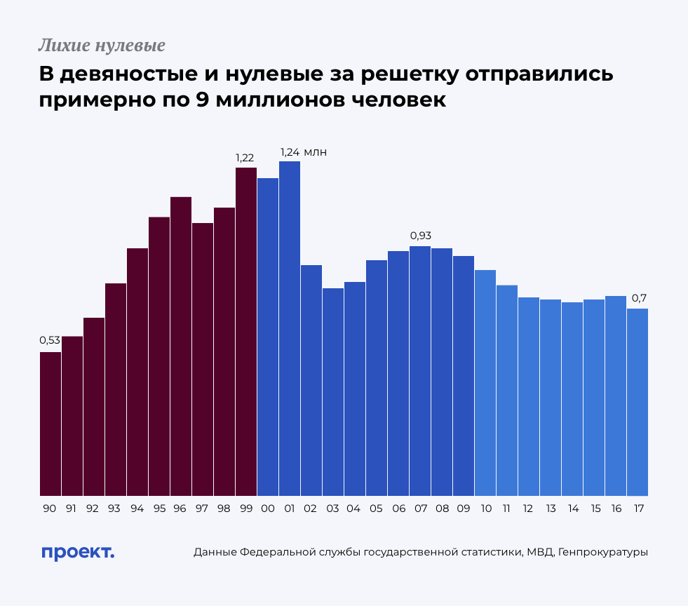 Статистика о числе осужденных по уголовным статьям, которую ведет Судебный департамент Верховного суда, подтверждает вывод о том, что нулевые годы превосходят девяностые в своей лихости. В 90-х осудили почти 9 миллионов человек, в нулевые — 9,4. И 6 млн приговоров — за восемь лет в десятых годах 21-века.