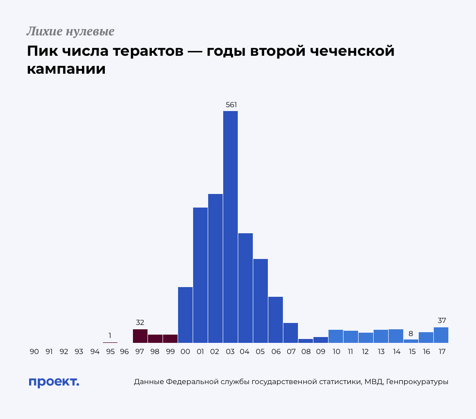 Пик статистики по терактам — годы второй чеченской кампании, с которой начал свое президентство Путин.