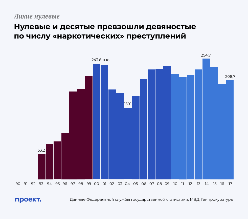 Однако при всем этом пик «наркотической преступности» — 2014 год, когда было зафиксировано почти 255 тысяч преступлений. В нулевые годы органы зарегистрировали почти 2,1 млн «наркотических» правонарушений — почти в два раза больше, чем в девяностых (правда, статистика МВД за этот период есть только с 1993 года). Десятые имеют все шансы сравняться с предыдущим десятилетием — за восемь лет МВД выявило около 1,8 млн таких преступлений.