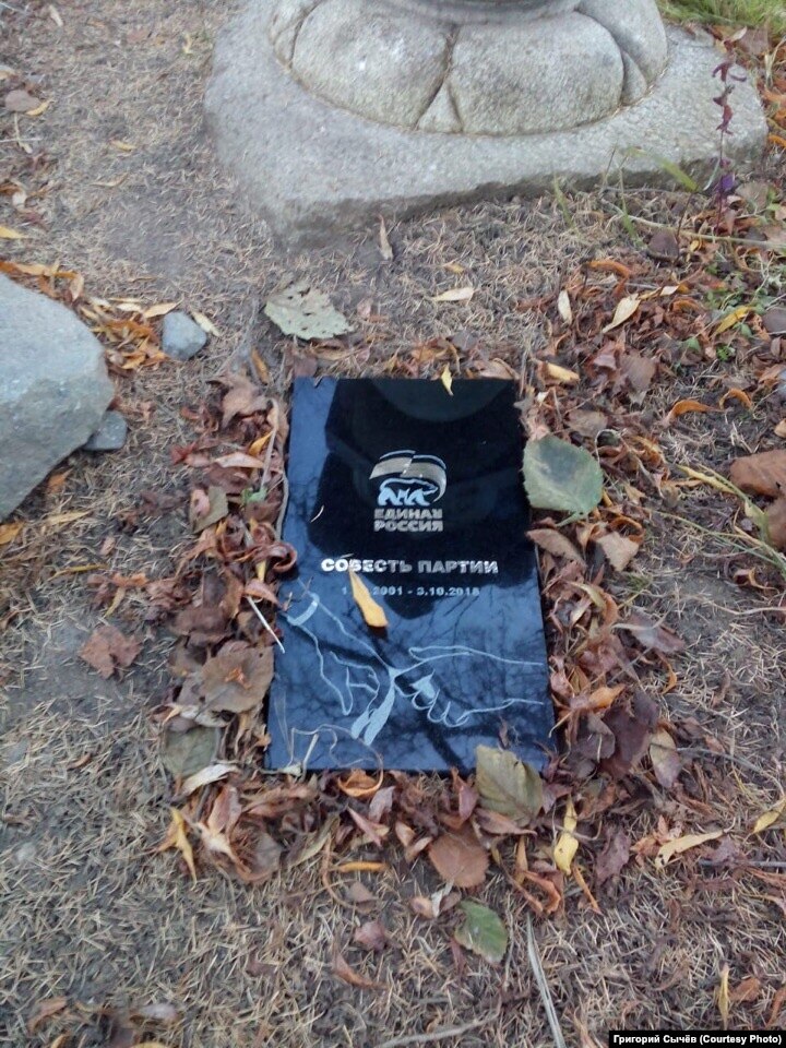 В одном из городских парков Магадана уставили памятник "Совести" партии "Единая Россия". Его сделал местный художник Григорий Сычев. Фото с плитой, напоминающую надгробие, он разместил на странице в Instagram. На создание мемориала он решился после принятия Госдумой России закона о повышении пенсионного возраста. По мнению автора, после этого "партия окончательно лишилась совести".
