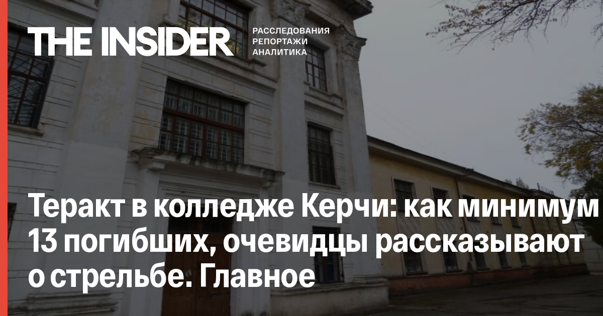 Как минимум 13 человек погибли и 50 пострадали в результате взрыва в здании политехнического колледжа города Керчи. Об этом сообщают местные СМИ со ссылкой на медиков. Национальный антитеррористический комитет сообщил, что произошел подрыв неустановленного взрывного устройства. Возбуждено уголовное дело по статье «Теракт».