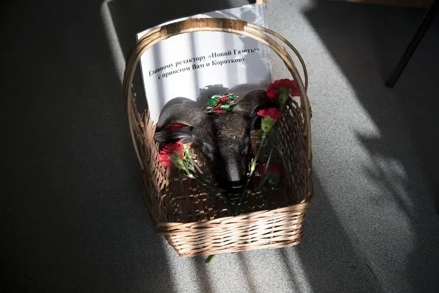 17 октября к зданию, где расположена редакция «Новой газеты», неизвестные подбросили похоронный венок с угрозами в адрес одного из журналистов редакции. А на следующий день, 18 октября, там же была обнаружена корзина с отрезанной головой барана, с очередной порцией угроз в адрес уже всей редакции и ее журналистов. Полиция проводит следственные мероприятия. Животное — жалко.