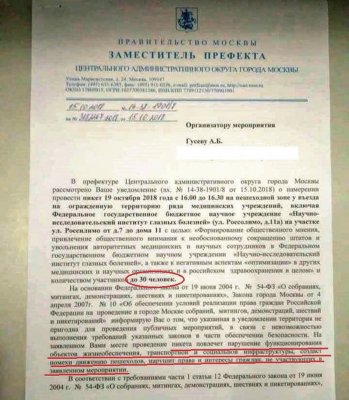 Активисты планировали провести пикет с количеством участников до 30 человек 19 октября у НИИ глазных болезней. По мнению администрации города, эта территория не пригодна для проведения публичных мероприятий, так как акция может помешать движению транспорта и пешеходов.