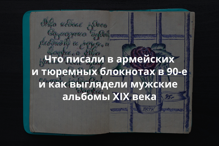 Итак, в первой трети XX века, поскольку был другой уровень грамотности, и больше народу имело доступ к созданию текстов, существовала некая устоявшаяся рукописная традиция в закрытых мужских сообществах. И дальше на протяжении всего XX века мы видим и в армейской, и в тюремной традиции солдатские и тюремные блокноты. Они на треть похожи на девичьи: поздравлениями, пожеланиями, стихотворениями и песнями, которые понравились авторам.