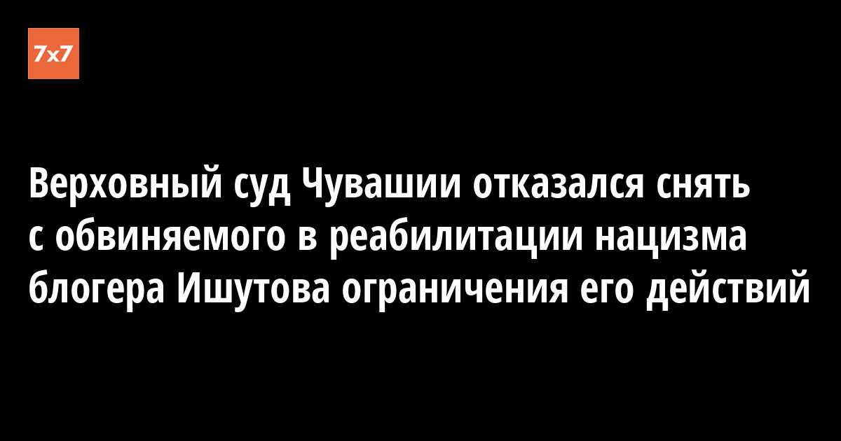 Верховный суд Чувашской Республики 18 октября рассмотрел апелляцию Константина Ишутова по мере пресечения, которую 8 октября установил Московский районный суд Чебоксар. Обвиняемый в реабилитации нацизма требовал отменить наложенные на него ограничения определенных действий. Об этом корреспонденту «7x7» сообщил адвокат обвиняемого Юрий Иванов из зала суда.