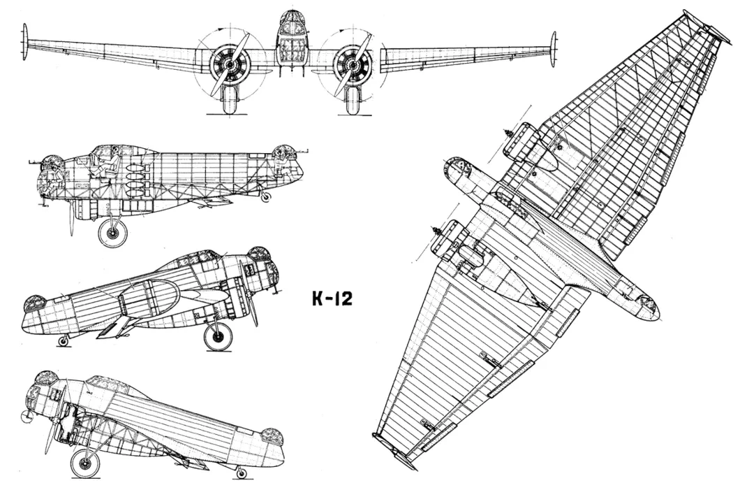 Бомбардировщик К-12 Калинина не имел хвоста. Первый в мире бесхвостый самолет был раскрашен под жар-птицу и летал в Москве на воздушном параде. Время менялось, теперь нужны были не самолетики для колхозников, а истребители для выпускников авиашкол, не роскошные гиганты с каютами класса люкс, а скоростные бомберы, способные пикировать почти до самой земли. Отсутствие хвостового оперения делало самолет быстрым, а воздушный стрелок на конце фюзеляжа получал идеальную позицию и полный обзор.
