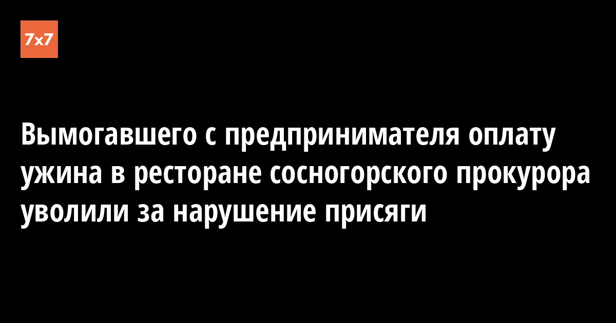 Исполняющего обязанности прокурора Сосногорска Сергея Полянского уволили за нарушение присяги. Он требовал у местного предпринимателя оплатить счет за совместный ужин в ресторане и избил его. Об этом «7x7» 22 октября сообщили в пресс-службе прокуратуры Коми.