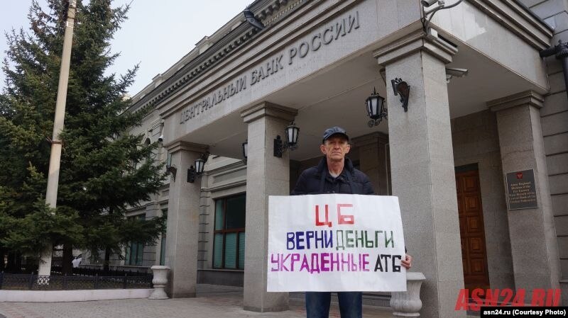 В Благовещенске прошел пикет у амурского отделения Центрального банка России. Пикетчик с плакатом "ЦБ ВЕРНИ ДЕНЬГИ УКРАДЕННЫЕ АТБ" сообщил, что из-за уговоров менеджеров Азиатско-Тихоокеанского банка потратил деньги банковского вклада на "более выгодные векселя" компании ФТК. В итоге семья амурчанина Анатолия Говоруна лишилась 600 тыс рублей.
