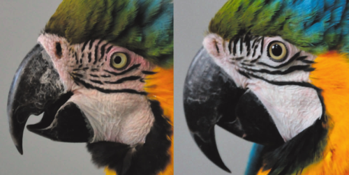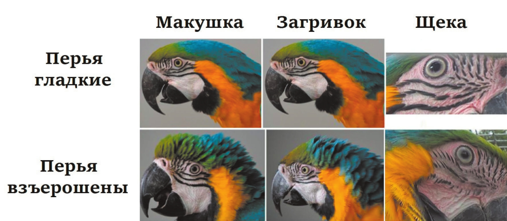 Их первым объектом стали сине-желтые ара Ara ararauna [1]. Головы попугаев покрыты разноцветными перьями, которые можно независимо взъерошивать на макушке, на лбу и на щеках (рис. 1). На макушке перья зеленые, на загривке синие, желтые и черные, а на щеках — полосатые, и когда они лежат гладко, полоски выглядят относительно ровными, а на взъерошенных перышках превращаются в пунктир. А еще у ара на щеках белая кожа, и видно, когда она краснеет (рис. 2). За этими шевелениями и изменением окраски удобно наблюдать.