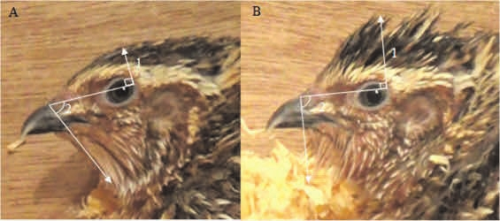 Исследователи работали с двумя лабораторными линиями C. coturnix. Птицы первой линии пугливы; попав в незнакомую обстановку, они надолго замирают. Перепела́ второй линии не столь боязливы и на новом месте замирают лишь на малое время. Ученые протестировали по двенадцать взрослых самцов из каждой линии, каждую птицу — единожды. Пе́репела сажали в незнакомую клетку, разделенную пополам непрозрачной перегородкой. Птица оказывалась в отделении с дном из проволочной сетки, где могла осваиваться в течение пяти минут. Затем перегородку убирали, и взорам птицы открывалось соседнее отделение, засыпанное стружкой, в которой можно барахтаться, осыпая себя пылью. На это занятие перепелу отводили десять минут, затем его возвращали в жилую клетку. Поведение птиц записывали на видеокамеру, и ученые потом измеряли высоту перьев на макушке, угол, на который подняты перья на горлышке, и площадь зрачка до и во время принятия ванны (рис. 3).