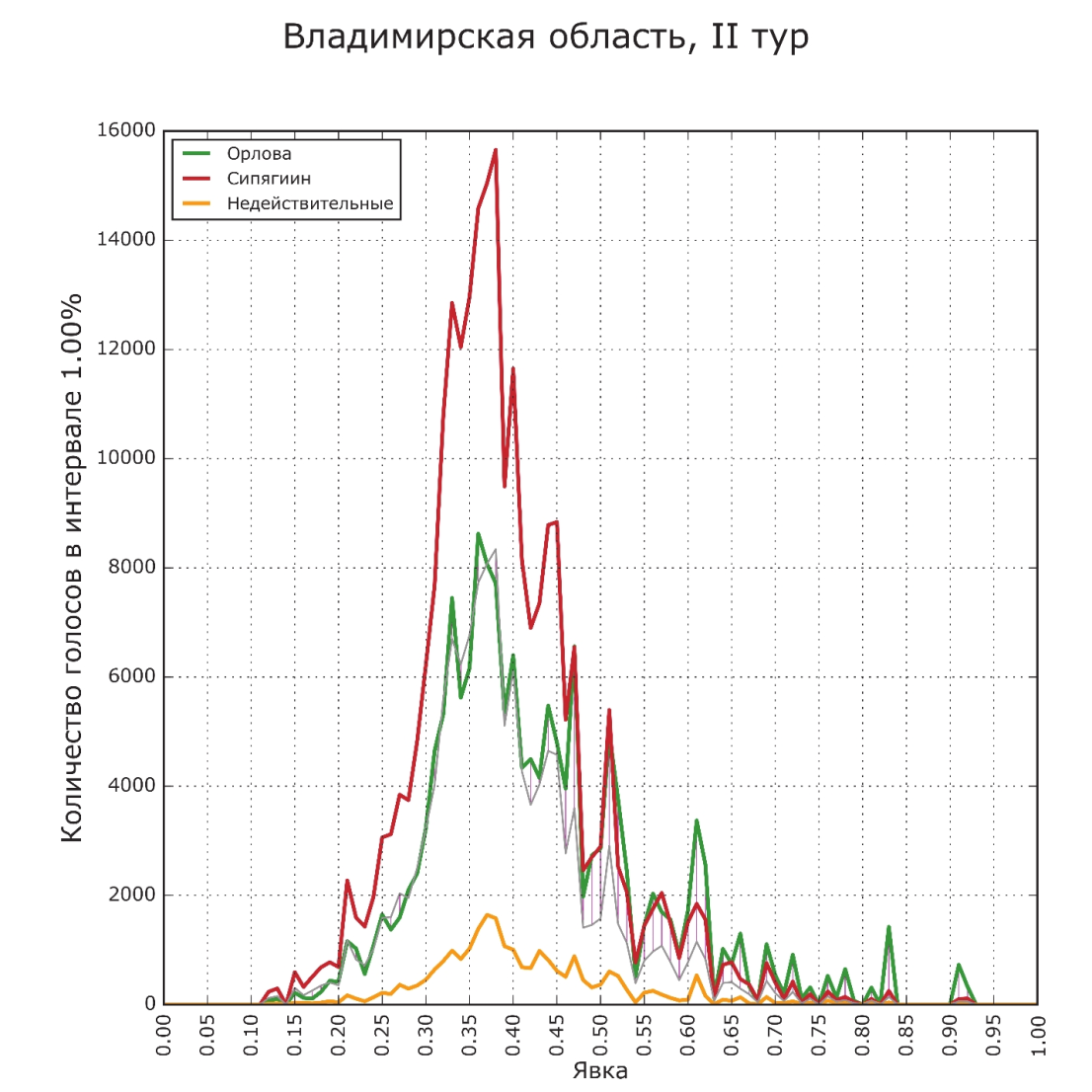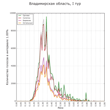 Рис. 3. Владимирская область, первый тур голосования. Губернатор Орлова немного превосходит идущего вторым Сипягина в основном пике распределения и сильнее — в «хвосте»