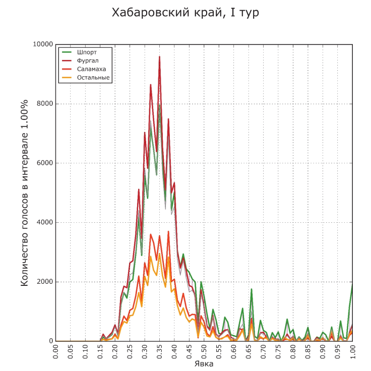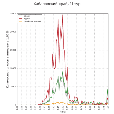 Рис. 2. Хабаровский край, второй тур голосования. Шпорт проигрывает Фургалу почти при всех явках, кроме совсем близких к 100% (военные участки?)