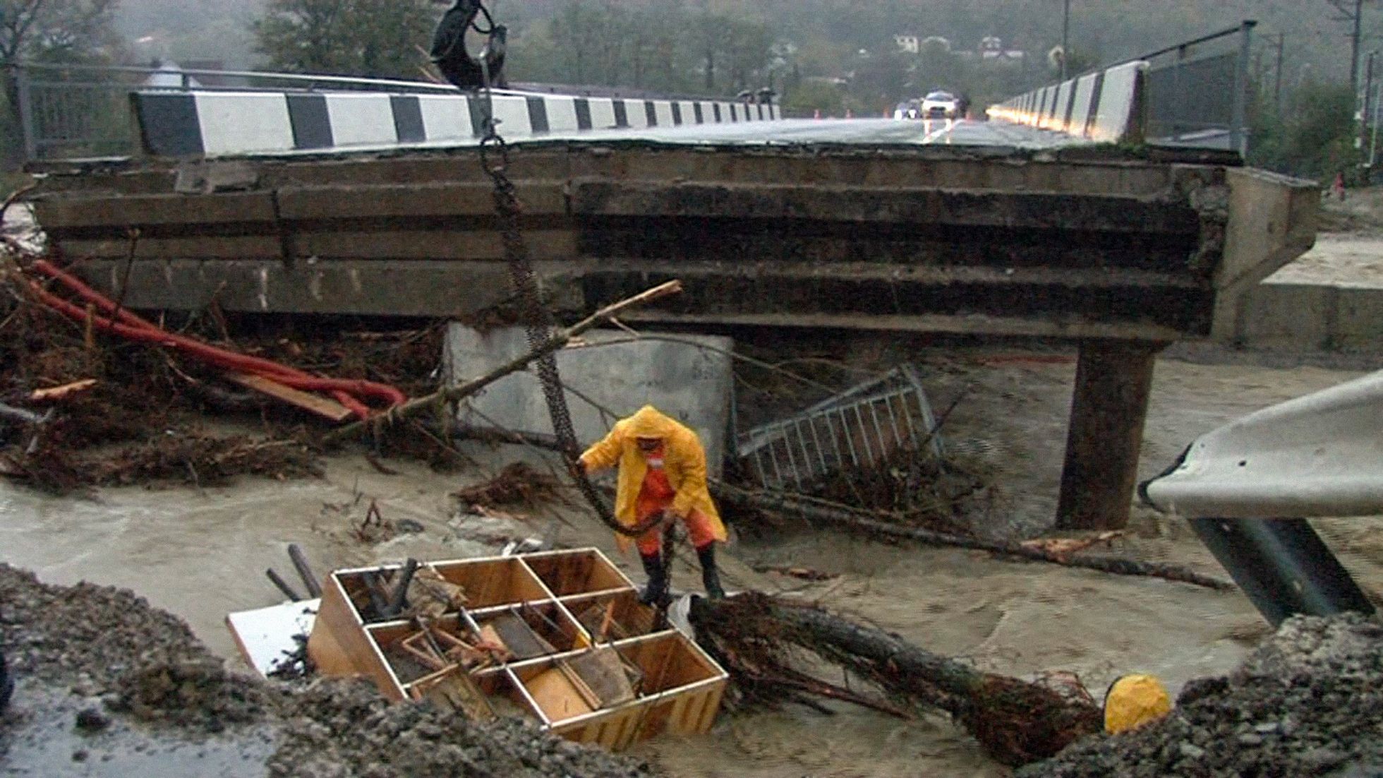 МЧС России / ТАСС / Scanpix / LETA Из-за сильного паводка в Краснодарском крае разрушен автомобильный мост на дороге Туапсе — Майкоп. Это главная трасса, ведущая в Сочи. Также прервано движение по железной дороге, пассажиров 35 остановившихся поездов планируют вывозить на автобусах. В некоторых районах около Сочи нарушено газоснабжение, подача электричества и питьевой воды. Сообщается о двух погибших и нескольких пострадавших.