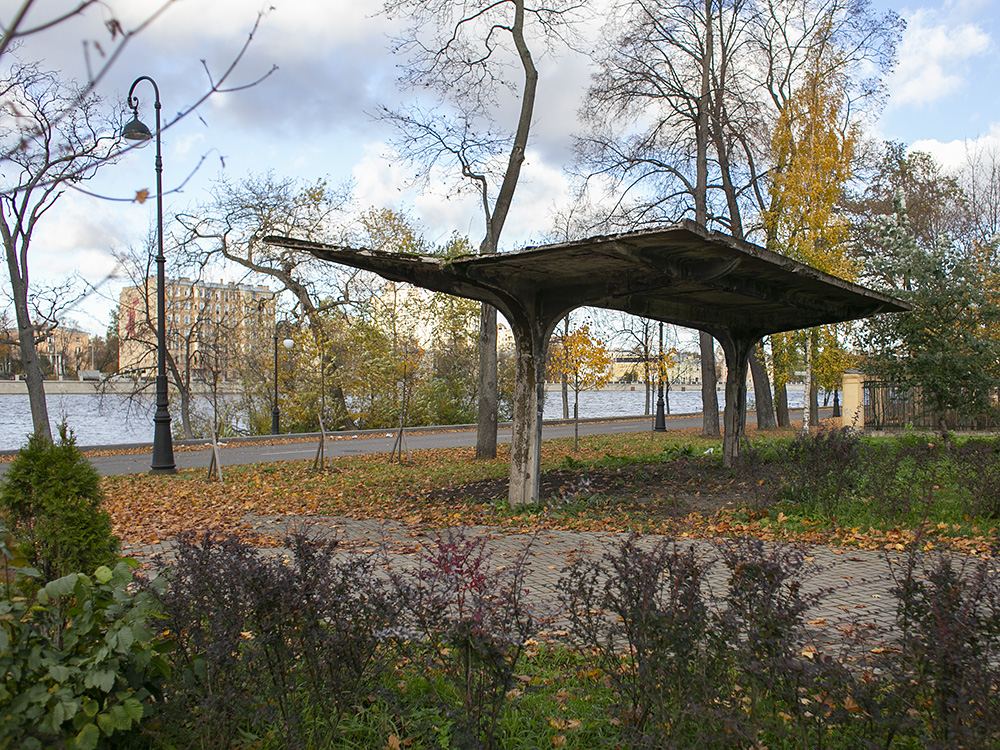 Павильон был окружен террасой и располагался на берегу пруда. Это позволило фирме продемонстрировать качество гидроизоляционных работ, которыми она, в том числе, занималась.