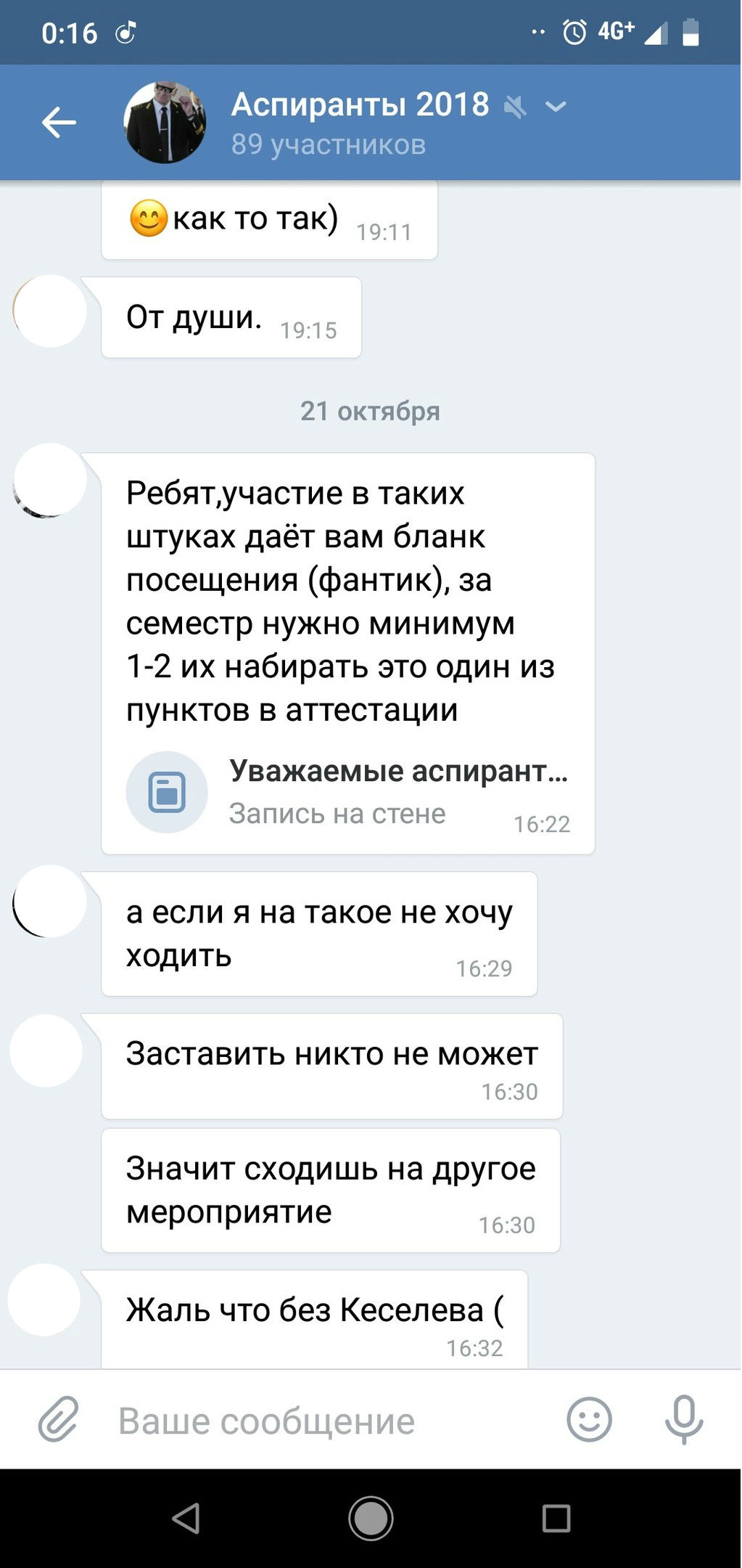 Как рассказала «Бумаге» активистка «Весны», скриншоты ей прислал аспирант Горного университета. Пост был опубликован 21 октября. По ее словам, к вечеру 24 октября пост уже был удален. Аспирант также прислал скриншот сообщения во «ВКонтакте», где говорилось, что «участие в таких штуках дает бланк посещения, за семестр нужно набрать 1–2 таких, это один из пунктов в аттестации». При этом уточняется, что «заставить [идти] никто не может».