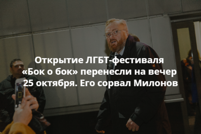 ЛГБТ-кинофестиваль «Бок о бок» перенес открытие на 19:00 в четверг, 25 октября. Запланированное начало фестиваля в среду сорвал депутат Госдумы Виталий Милонов. Об этом «Бумаге» сообщили организаторы.