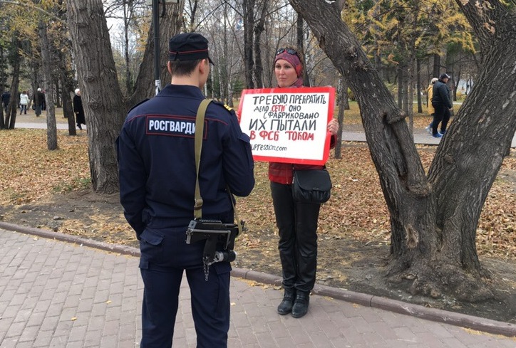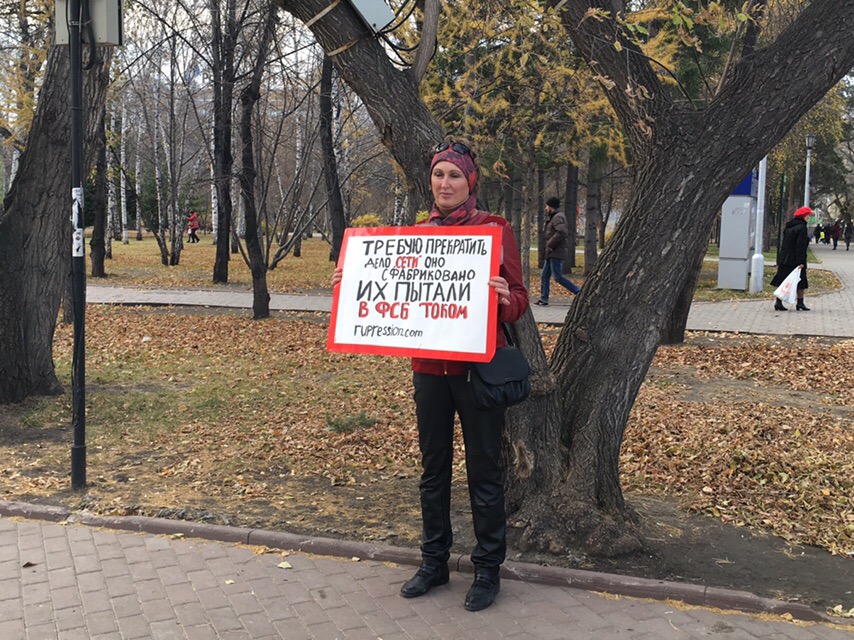 28 октября в нескольких городах России состоялись акции в поддержку обвиняемых по делам сообществ "Сеть" и "Новое величие". Серия одиночных пикетов в поддержку обвиняемых состоялась в этот день и в Новосибирске. В акции приняла участие мать фигуранта так называемого пензенского дела антифашиста Армана Сагынбаева Елена Стригина – она по-прежнему живет в Новосибирске, а сын несколько лет назад уехал из родного города в Петербург.