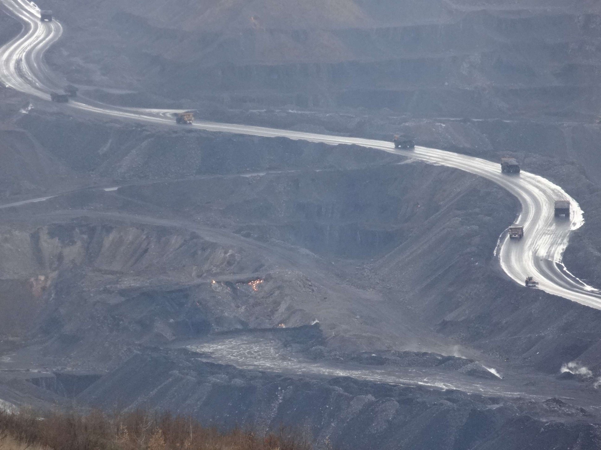 Наверху работают два сортировочных комплекса и обогатительная фабрика, где уголь недостаточной теплоемкости, с примесями, отделяют от всего ненужного и формируют, если можно так выразиться, "гранулы" (комочки). На это нужно много воды, кроме того, из разреза постоянно надо откачивать воду. Можете себе представить, сколько грязи попадает с этой черной водой в окружающую среду.