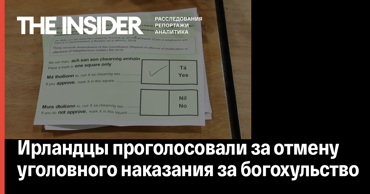 В Ирландии прошел референдум, рассматривавший вопрос отмены уголовного наказания за богохульство. Как сообщает ирландская телерадиокомпания RTE, большинство проголосовавших поддержали отмену наказания.