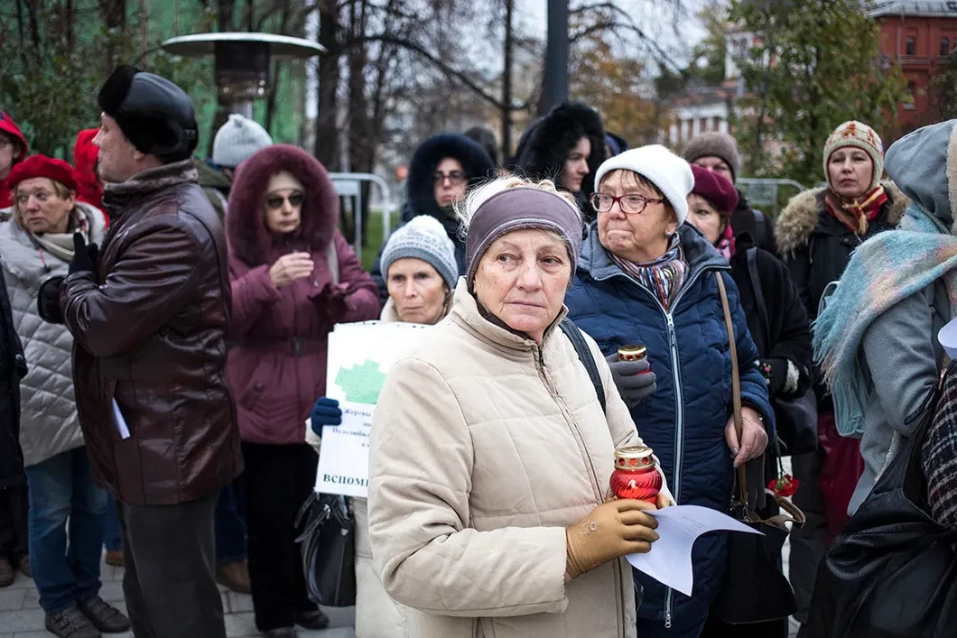 С 10 утра у Соловецкого камня на Лубянке их вспоминают вслух. Совсем молодые девушки и парни, мамы с колясками, тяжело опирающиеся на палочки пенсионеры, мужчины, женщины, дети. Многие, зачитав страшно короткую биографическую справку — имя/должность/дата расстрела — вспоминают своих репрессированных родственников. «Мой прадед Самойленко Федосей Петрович был зверски убит за то, что склонил голову перед советской властью», «Мой отец Роман Петрович Абрамов, 56 лет, управляющий всесоюзным трестом «Хлебострой», расстрелян 8 января 1938 года. Моя мама и я объявлены членами семьи изменника Родины, мама 8 лет провела в Казахстане на тяжелейших работах, я в Сибири — в детском доме. Вечная память моим родным»...