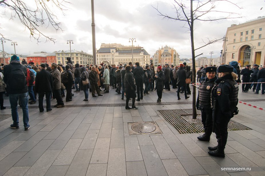 Корреспондент «7x7» попытался выяснить у сотрудников полиции, планируют ли они прекращать акцию и в каком случае на площади могут начаться задержания. От официальных комментариев они отказались, но в частной беседе сообщили, что в данном формате акция законна и в действиях протестующих не содержится состава административного правонарушения. На вопрос, будет ли нарушением скандировать лозунги, сотрудница полиции ответила, что это зависит от того, что будут кричать и сколько человек это поддержит. Что именно нужно кричать на площади, чтобы это стало нарушением, представитель власти не пояснила.