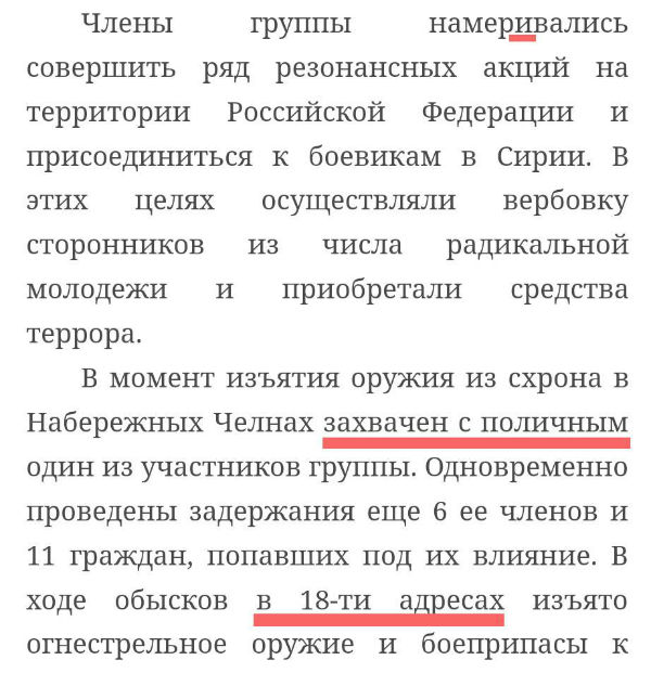 Когда именно прошли задержания, в ФСБ не уточняют. Они проводились при содействии МВД и Росгвардии. Одного из "членов ячейки" схватили в Набережных Челнах якобы "в момент изъятия оружия из схрона". По 18 адресам прошли обыски: как утверждают в спецслужбе, изъяты огнестрельное оружие, боеприпасы к нему, некая "экстремистская литература" и атрибутика ИГ.